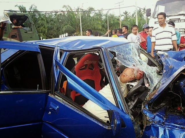 Gambar kemalangan maut di Jalan Tungku Lahad Datu Sabah pada 6 April 2014. Kemalangan ngeri yang berlaku di jalan KM 15 Jalan Tungku – Lahad Datu telah menyebabkan 3 mangsa maut termasuk bayi berumur 9 bulan. Turut maut adalah pemandu yang dikenali sebagai Razahman bin Sulaiman berasal dari Kampung Rancangan Silabukan. Menurut saksi, kemalangan itu berpunca daripada kereta yang dipandu laju sebelum terbabas.