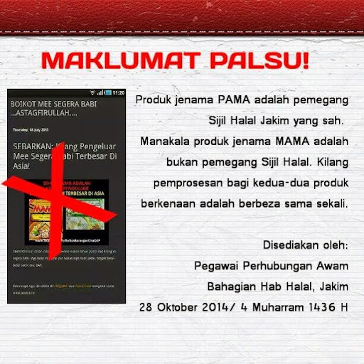 Berita yang tersebar mendakwa kedua-dua produk Mee Segera jenama PAMA dan MAMA mengandungi khinzir. Namun, pihak JAKIM menerusi kenyataan rasmi pada 28 Oktober 2014 mendakwa hanya produk mee segera jenama PAMA sahaja disahkan halal manakala jenama MAMA adalah bukan pemegang sijil halal JAKIM yang sah.